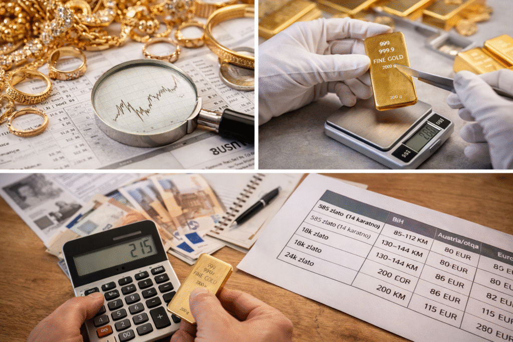 Zlato je oduvijek predstavljalo sigurnu vrijednost, zato i ne čudi što je toliko traženo. U ovom članku donosimo sve što vas može zanimati o zlatu. Bilo da želite prodati nakit ili kupiti neki novi komad, odgovorit ćemo na najvažnija pitanja: sve o cijenama zlata u BiH, uporediti cijene, te kako postići najpovoljnije ponude i kako izbjeći prevare.